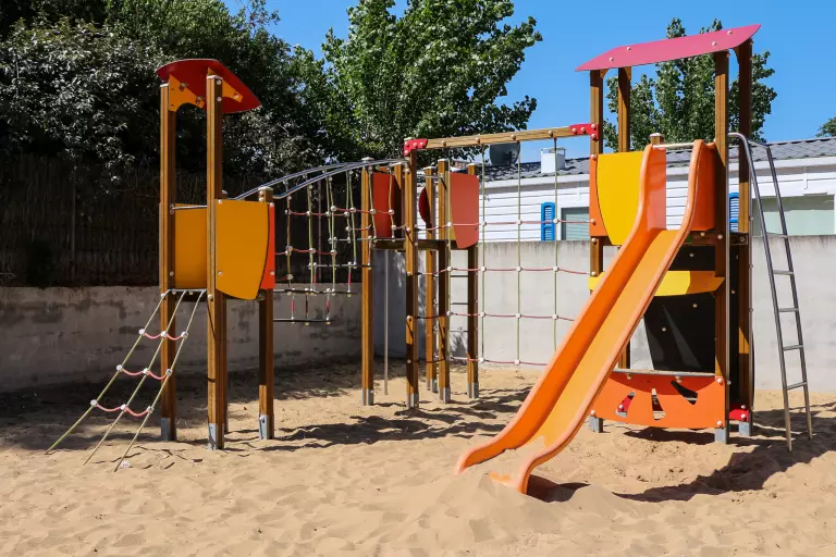 - Aire de jeux pour enfants : Zone de jeux pour enfants outdoor : bac à sable, portique, toboggan, trampoline